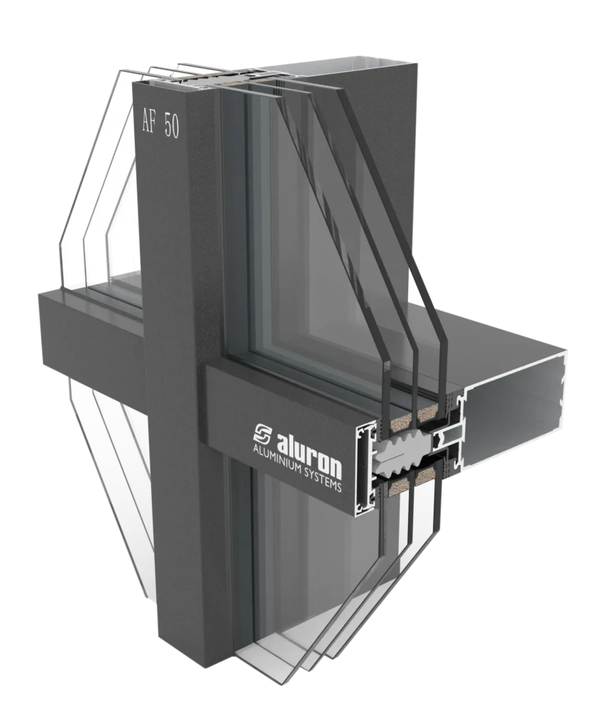 AF-50 ir mūsdienīga viena profila fasāžu sistēma, kas paredzēta vieglo aizkarfasāžu izbūvei, izmantojot imposts–imposts tehnoloģiju ar vienu profilu. Šāds konstrukcijas risinājums nodrošina efektīvu materiālu izmantošanu un optimizētu ražošanas procesu, vienlaikus saglabājot augstu konstrukcijas izturību un stabilitāti. AF-50 sistēma piedāvā plašas arhitektūras un dizaina iespējas, padarot to īpaši piemērotu modernām dzīvojamām, biroju un sabiedriskām ēkām. Sistēmas konstrukcija ļauj veidot estētiski tīras un vizuāli vieglas fasādes ar precīzām vertikālām un horizontālām līnijām. Izmantotie tehniskie risinājumi nodrošina augstus siltumizolācijas un gaisa necaurlaidības rādītājus, kas atbilst mūsdienu energoefektivitātes prasībām. AF-50 fasāžu sistēma apvieno funkcionalitāti, efektivitāti un mūsdienīgu izskatu, piedāvājot uzticamu risinājumu ilgtspējīgai būvniecībai.