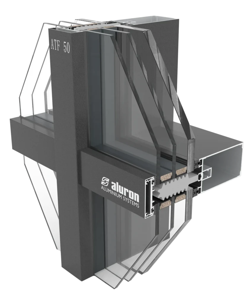 ATF 50 ir fasāžu sistēma, kas izstrādāta mūsdienīgām ēkām ar īpaši augstām siltumizolācijas prasībām. Sistēmas konstrukcija balstās uz viena profila risinājumu, kas nodrošina augstu energoefektivitāti un stabilu konstrukcijas darbību. Izmantojot ATF 50 sistēmu, iespējams veidot gan plaknes fasādes, gan jumta stiklojuma risinājumus. Sistēmā integrētie tehniskie risinājumi nodrošina augstu ūdensnecaurlaidību un efektīvu aizsardzību pret gaisa caurlaidību. Īpaši izstrādātā aizpildījuma stiprinājuma konstrukcija nodrošina pilnīgu izotermisko izlīdzinājumu, kas būtiski uzlabo siltumizolācijas rādītājus un kopējo fasādes energoefektivitāti.